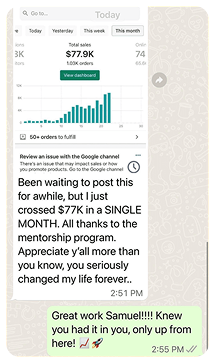 Samuel did over $78,000 in sales in a single month within his third month of joining the coaching program